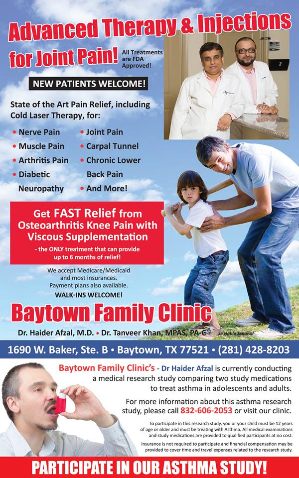 The Baytown Health Group proudly announces all-new advanced therapy and injections for joint pain. We provide state of the art pain relief including cold laser therapy for conditions like Nerve Pain, Joint Pain, Muscle Pain, Carpal Tunnel, Arthritis Pain, Chronic Lower, Diabetic, Back Pain, Neuropathy and more. All treatments are FDA approved, New patients are welcome.